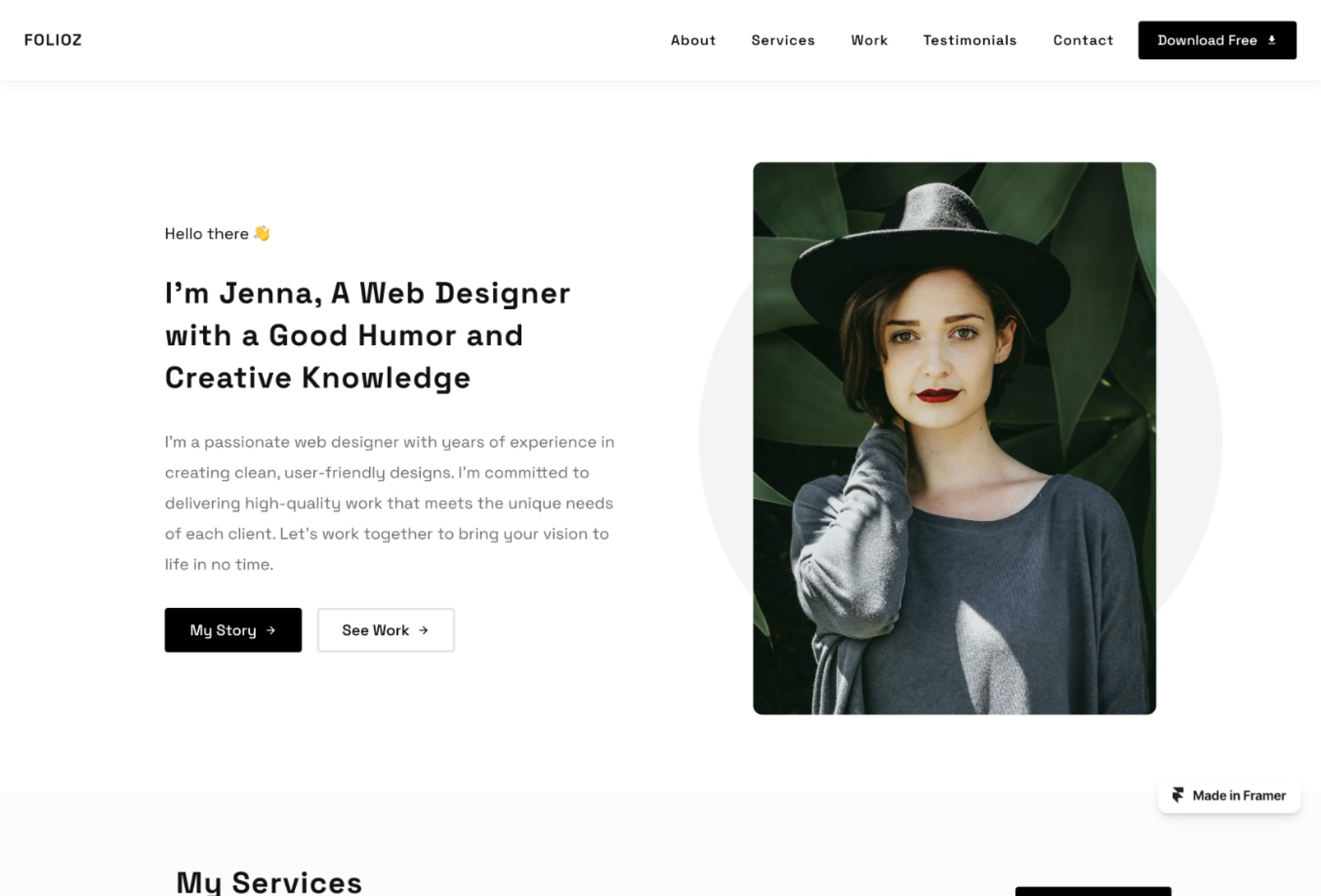 Folioz is a minimal, clean personal portfolio template for Framer, ideal for freelancers, designers, and anyone requiring an uncomplicated portfolio website without any cost.